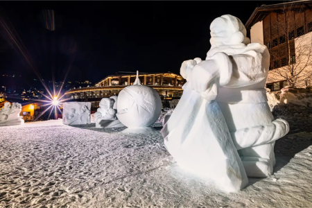Internationale kunstenaars maken ijssculpturen in de voetgangerszone van Santa Christina. De transparante kunstwerken weerspiegelen prachtig in het winterlicht en trekken veel bewonderaars.